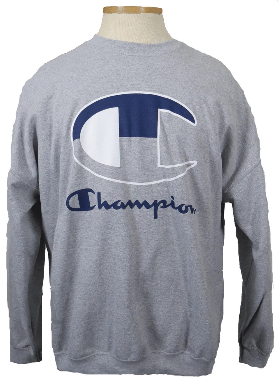 Champion Sportswear, quality you can trust at a price you can afford! This crew neck sweatshirt is sure to be one of your favorites for years to come! Heather Gray Crew neck features a large, bold Champion logo in navy and white on the front, with the Champion name in navy blue script underneath. Made of a mid-weight blend of 50% Cotton, 50% Polyester to hold its shape, wash after wash.