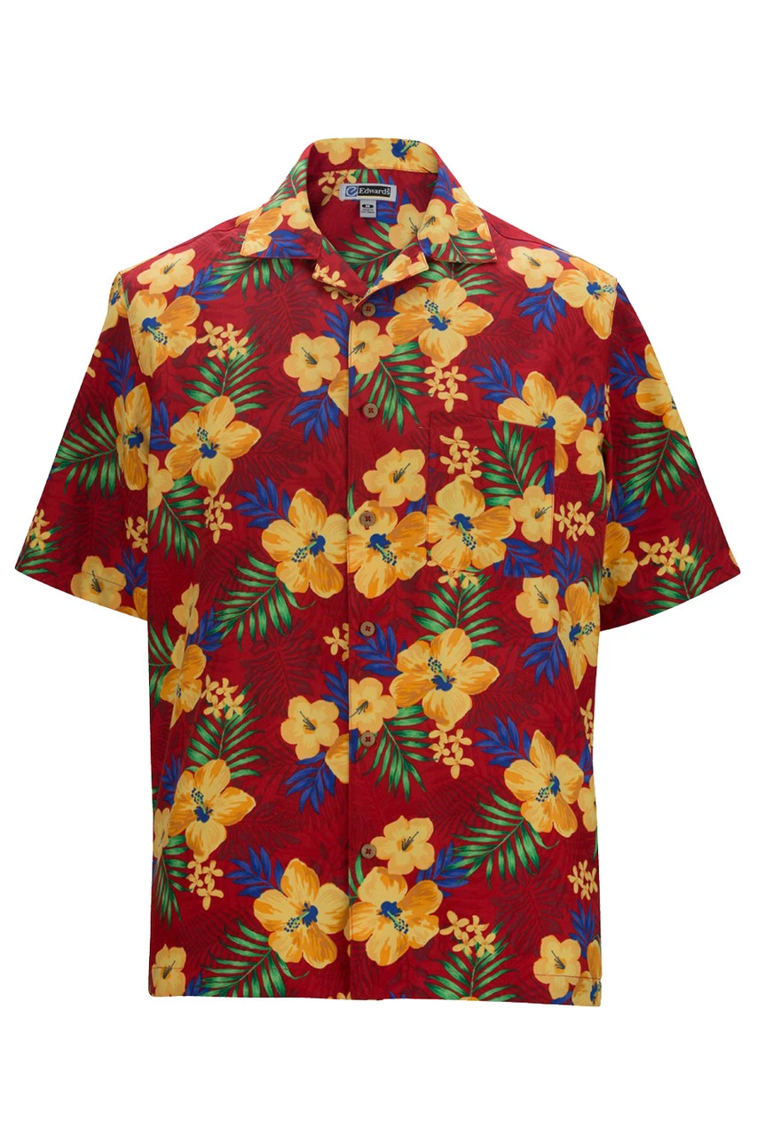 Colorful and stylish this shirt is carefree, fun to wear and offers all day comfort. The soft fabric has a playful hibiscus pattern that stands out in a crowd. Multi-color hibiscus print with vibrant colors accent this soft and supple fabric. Classic camp style, open neck with notched collar, full cut, left chest pocket and side vents at hem. Features natural buttons on placket, straight back yoke seam and two shoulder seams. Wrinkle resistant, soil release and moisture wicking for comfort and easy care. Fabric content: 100% Polyester.