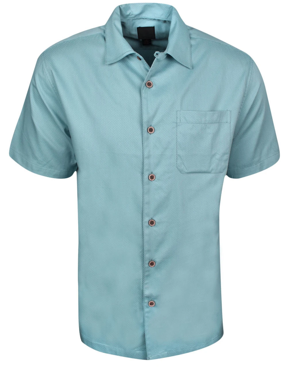 This F/X Fusion camp shirt has wooden buttons, one chest pocket with button closure and side vents. It has a subtle tonal diamond pattern. 52% cotton, 48% rayon.