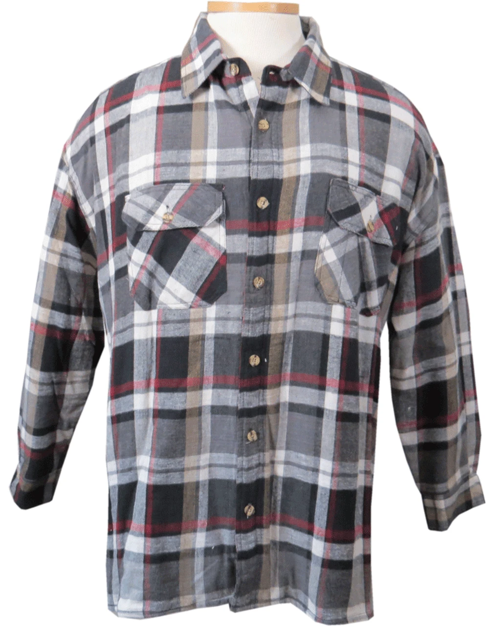 This line Flannel Shirt by Falcon Bay is perfect for layering when the temperature drops! Made of soft, cotton flannel on the outside with a jersey fleece lining to keep you warm without the bulk. It features a button front, two chest pockets with button closures and two side hand warmer pockets. Traditional gray, tan and red plaid pattern. Fabric content: Shell, 100% Cotton; Lining, 100% Polyester.