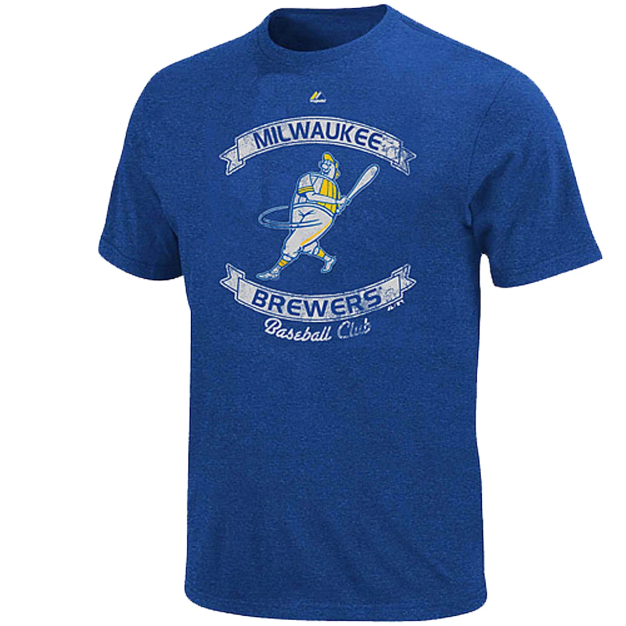 This Majestic brand tee shirt has a Cooperstown Collection label. It has the graphic printed on the front of a heather blue tee. It is 60% cotton, 40% polyester.